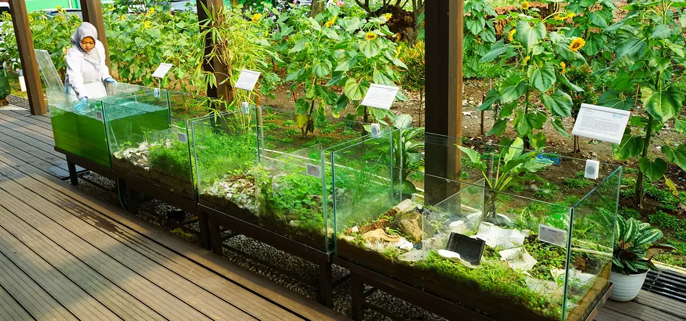 The Living Lab is a miniature biodegradation process of Greenhope products (Oxium, Ecoplas, and Naturloop) that aims to visualize the fourth concept of the 4Rs, namely Return to Earth. Greenhope products are placed in a terrarium that resembles a natural environment and monitored until biodegradation occurs. There are 3 terrariums using soil media, and 1 aquarium using microalgae. Each terrarium is divided into 2 parts: conventional plastic and Oxium/Ecoplas/Naturloop.